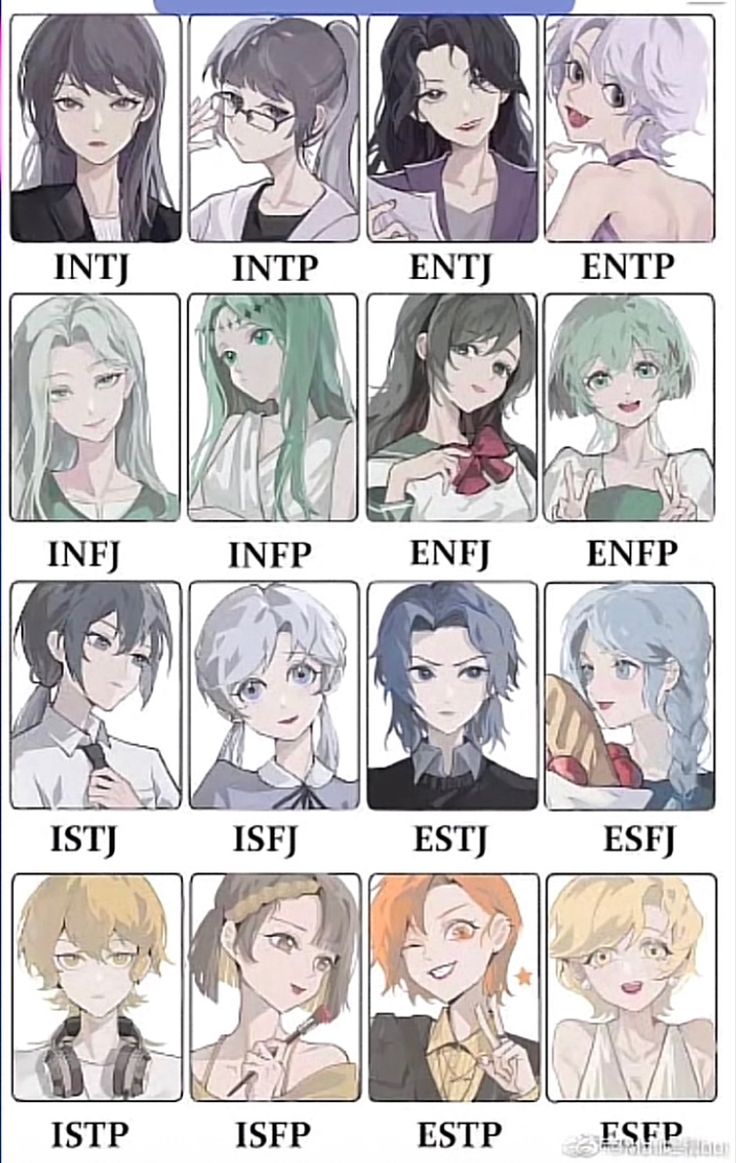 - INFP-A / INFP-T (열정적인 중재자) : 상냥한 성격의 이타주의자. 건강하고 밝은 사회 건설에 앞장서는 낭만형.