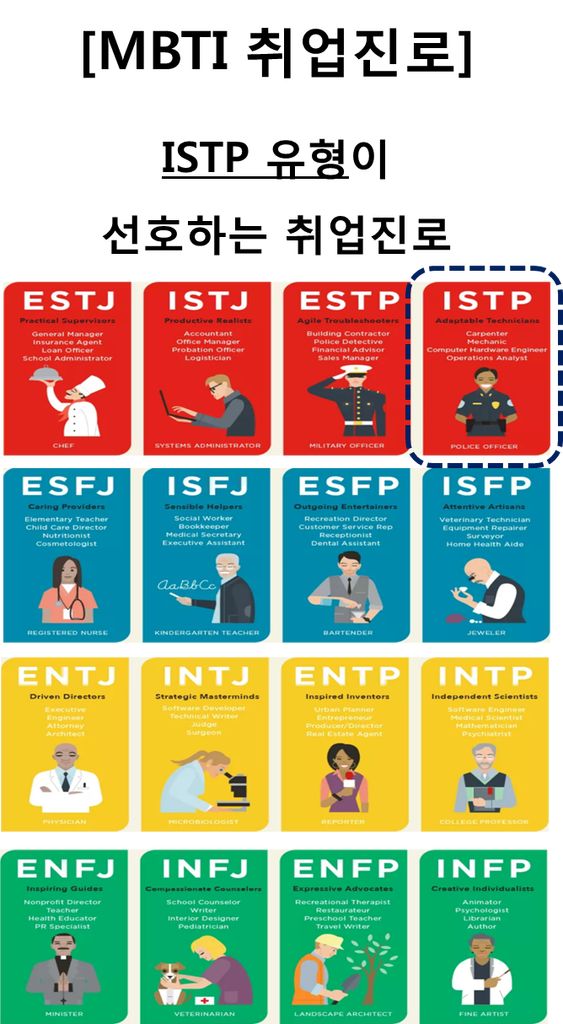 - ISTP-A / ISTP-T (만능 재주꾼) : 대담하고 현실적인 성향. 다양한 도구 사용에 능숙한 탐험형.