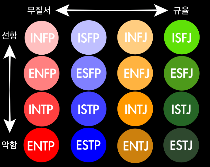 각 요소를 조합하여 총 16가지 성격 유형이 만들어집니다: