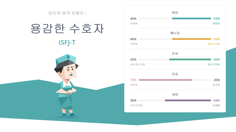 - ISFJ-A / ISFJ-T (용감한 수호자) : 소중한 이들을 수호하는데 헌신적이며 성실한 방어자형.